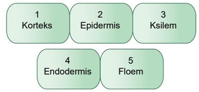 3. Doğru Cevabın Açıklaması: Şekilde III numara ile gösterilen yapı, odun ve kabuk arasında yer alan damar kambiyumudur (vasküler kambiyum). Kambiyum, bitkinin enine kalınlaşmasını (ikincil büyüme) sağlayan bir lateral (yanal) meristem dokusudur. Seçenekte belirtilen apikal (uç) meristem ise bitkinin kök ve gövde uçlarında bulunur ve boyca uzamayı (birincil büyüme) sağlar. Dolayısıyla III numaralı yapının "apikal meristem" olarak tanımlanması biyolojik olarak yanlıştır.