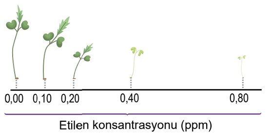 I. Mekanik stresle karşılaşan genç fidelerde etilen miktarı artar: Şekilde "etilen konsantrasyonu" değiştikçe fidenin verdiği tepkiler gösterilmiştir. Bitki fizyolojisinde mekanik stres, etilen sentezini tetikleyen temel faktördür. Deney, bu stresin sonucu olan etilen miktarının bitki üzerindeki etkisini test etmektedir. Bu, konunun temel çıkarımıdır.