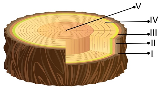 E) V. Öz odununu gösterir: Doğrudur. Gövdenin en merkezinde bulunan, zamanla madde birikimiyle tıkanan ve desteklik görevi gören en yaşlı ksilem tabakası öz odunudur.