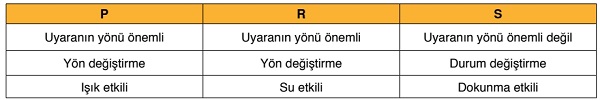 Soru 7. Bitkilerin farklı uyaranlar karşısında gösterdikleri hareket şekillerinden bazıları P, R ve S şeklinde aşağıdaki tabloda verilmiştir.