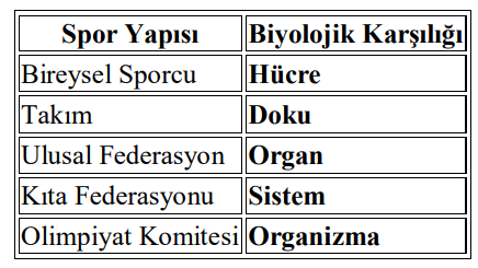 📎 Açıklama: Tek bir sporcu, tek bir hücre gibi bağımsız hareket eder. Takım, aynı görevi yapan sporculardan oluşur → tıpkı benzer hücrelerin oluşturduğu doku gibi. Federasyon, farklı takımların bir araya gelmesidir → organ gibi. Kıta federasyonu, farklı federasyonları kapsar → sistem gibi. Olimpiyat komitesi ise tüm bu yapıları birleştirir → organizma gibi.