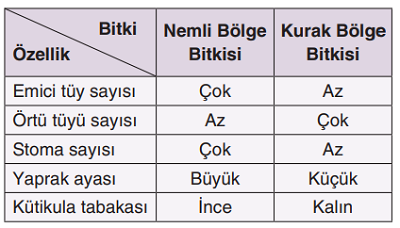Buna göre tabloda bitkilerin yaşadığı ortama göre sahip olması beklenen hangi özelliğe ait bilgi yanlış verilmiştir?