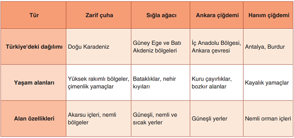 Bir öğrenci Türkiye'nin farklı bölgelerinde bulunan bitki örneklerini inceleyerek aşağıdaki tabloyu oluşturmuştur.