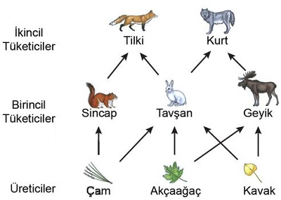 Besin ağı grafiğinde canlılar arası beslenme ilişkileri yönlü oklarla gösterilmiş. Oklar “yenen → yiyen” şeklindedir.