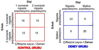 Kontrol Grubu (Nişasta–nişasta) Çiftleşme sayıları dengeli, bireyler arasında belirgin bir tercih yok.