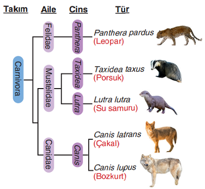 🔽 Genişten → özele: Âlem → Şube → Sınıf → Takım → Aile → Cins → Tür