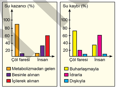 D) İnsanın idrarla su kaybı, çöl faresine kıyasla daha fazladır. ✅ İdrarla su kaybı oranı insanda daha yüksek (pembe çubuk daha büyük).