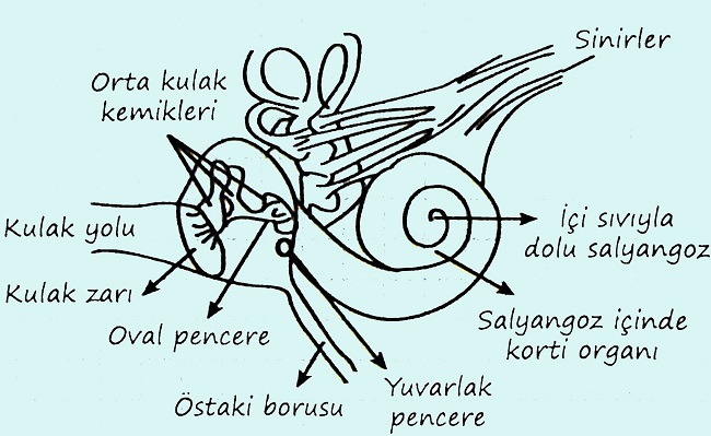 Aşağıdaki şema, insan kulağında, ses dalgalarının beyne uyarı olarak iletimini sağlayan yapıları göstermektedir.