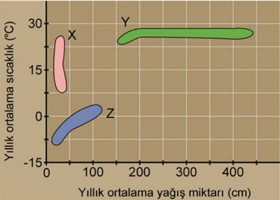 Aşağıdaki iklim grafiğinde X, Y, Z karasal biyomları gösterilmiştir.