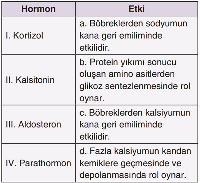 Aşağıdaki tabloda bazı hormonlar ve bu hormonların etkileri karışık olarak verilmiştir.