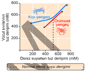 Aşağıdaki grafik; kıyı yengeci ve örümcek yengecin vücut sıvılarının tuz derişiminin, yaşadıkları deniz suyunun tuz derişimindeki değişimlerden nasıl etkilendiğini göstermektedir. Çizgilerin iki ucundaki işaretler (*), bu yengeçlerin yaşayabildikleri deniz suyu tuz derişimi sınırlarını belirtmektedir.