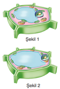 İzotonik çözeltideki bir bitki hücresinin durumu şekil 1’de gösterilmiştir. Bu hücrenin izotonik çözeltiden alınıp yoğunluğu bilinmeyen bir çözeltiye bırakıldığında şekil 2’deki duruma geçtiği gözlenmiştir.