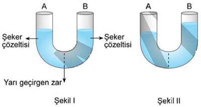 “U” şeklinde bir cam boru, şeker moleküllerine geçirgen olmayan yarı geçirgen bir zarla bölünüyor. Bu borunun A ve B kollarına eşit hacimlerde fakat farklı derişimlerde şeker çözeltileri konuyor (Şekil I, başlangıç durumu). Bir süre beklendikten sonra bu borunun kollarındaki çözelti seviyelerinin sabit hâle geldiği görülüyor (Şekil II, son durum).