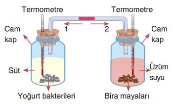 Aşağıdaki düzenekte yoğurt bakterileri ve bira mayaları, içerisinde süt ve üzüm suyu bulunan iki farklı cam kaba konulmuştur. Oda sıcaklığında bulunan havası alınmış cam kaplar, renkli sıvı içeren bir cam boru ile birbirine bağlanmıştır.