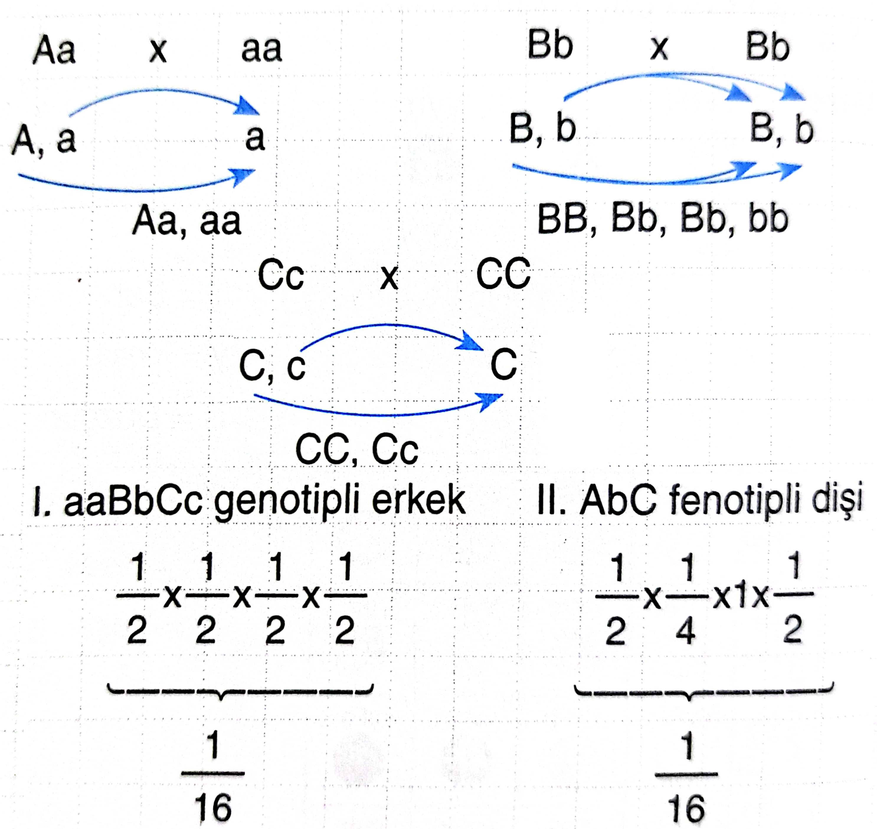 Örnek; AaBbDd genotipine sahip bir bireyin aBd genotipine sahip bir gamet oluşturma olasılığı nedir? (Genler bağımsızdır)![]() |