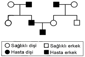 Popülasyonda görülme sıklığı yüksek olan kalıtsal bir hastalığın kalıtım şeklini belirlemek isteyen bir araştırmacı, bu hastalığın görüldüğü bir ailenin soyağacını aşağıdaki gibi çiziyor.