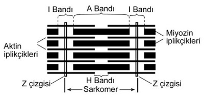 Açıklaması: Kol kasının kasılması sürecinde; A bandı değişmez çünkü A bandı aktin ve miyozin filamentlerinden oluşan bölgedir. I bandı daralır, çünkü aktin filamentleri birbirine yaklaştırır. H bandı daralır veya tamamen kaybolur,; bu bant, sadece sarkomerin kasılmadığı durumlarda görülen boşluktur. Z çizgileri birbirine yaklaşır. Bu sarkomerin kısalması ile ilişkilidir. Sarkomer boyu kısalır. Bu kasılma sırasında aktin ve miyozin filamentlerinin kaynaşması ile olur. Sarkomerin kütle ve hacmi değişmez. Kol kasının gevşemesi sürecinde; A bandı boyu değişmez, I bandı ve H bandı genişler. Z çizgileri birbirinden uzaklaşır. Sarkomerin boyu eski haline döner. Sarkomerin boyu uzasa da kütle hacmi değişim olmaz.