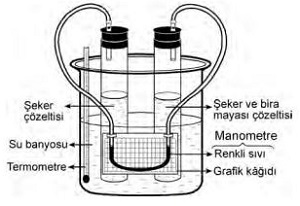 Şekildeki gibi bir deney düzeneği hazırlanıp su banyosunda sırasıyla 20 oC, 30 oC ve 40 oC'de onar dakika tutularak deney tekrarlanıyor. Deney süresince 2 dakika arayla manometredeki renkli sıvı düzeyi okunarak kaydediliyor.