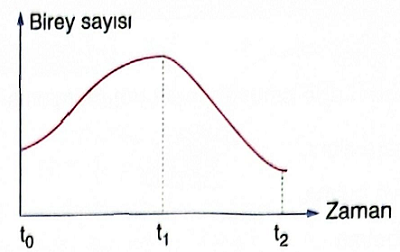 Soruda bir popülasyonun zamanla birey sayısındaki değişimi verilen bir grafik üzerinden analiz isteniyor. Görsel olmadan durumu şöyle açıklayabiliriz: Grafik Yorumu (Genelde şu şekilde olur): t₀ - t₁ arası: Birey sayısında artış t₁ - t₂ arası: Birey sayısında azalma