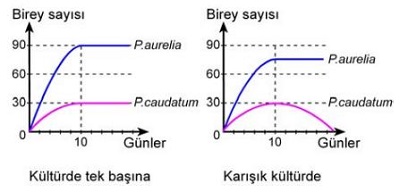 Paramecium (terliksi hayvan) türlerinden olan P. aurelia ve P. caudatum türlerinin tek başına ve karışık kültürlerindeki birey sayıları aşağıdaki grafiklerde gösterilmiştir.