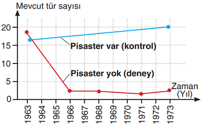 Grafikte, Pisaster ochraceous adlı bir denizyıldızının ekosistemde bulunup bulunmamasının, mevcut tür sayısı üzerindeki etkisi gözlemlenmiştir: Pisaster var (kontrol): Tür sayısı zamanla korunmuş veya artmış, Pisaster yok (deney): Tür sayısı hızla azalmış ve düşük seviyede kalmış, Pisaster'in midyeyle beslendiği bilgisi de önemli. Şimdi verilen ifadeleri değerlendirelim: