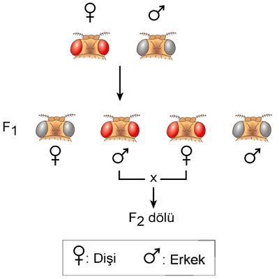 → Laboratuvarda yapılan bir deneyde kırmızı gözlü bir dişi, beyaz gözlü bir erkekle çaprazlanarak F1 dölü (kırmızı gözlü erkek ve dişi, beyaz gözlü erkek ve dişi bireyler) elde edilmiştir.