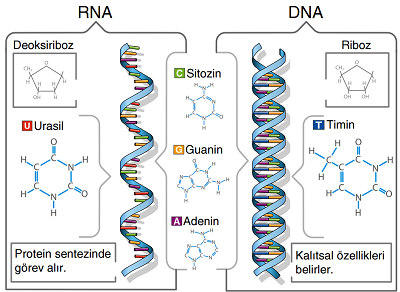♦ RNA, tek sarmal yapıda olup, dört baz içerir: adenin (A), urasil (U), guanin (G) ve sitozin (C). DNA'daki timinin yerine RNA'da urasil bazı vardır.
