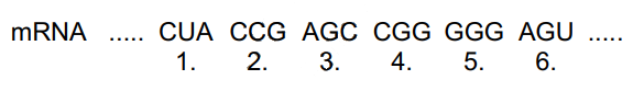 Aşağıda bir ökaryotik hücrede 90 amino asitten oluşan bir polipeptidin sentezlenmesine esas teşkil eden bazı mRNA kodonları ve bunlara karşılık gelen amino asitlerin sırası verilmiştir.