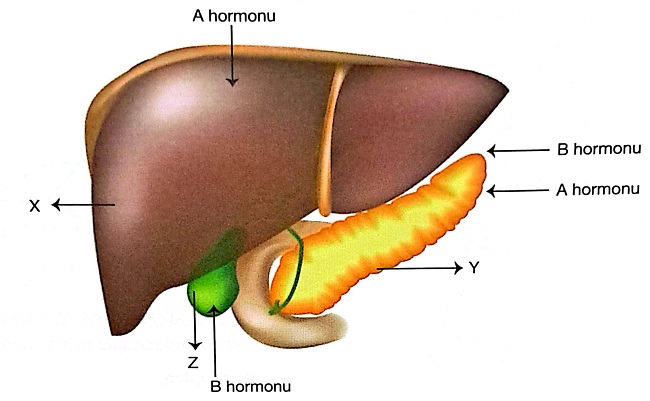 Aşağıda sindirime yardımcı organlar X, Y, Z ile bu organların faaliyetini düzenleyen hormonlar ise A ve B ile gösterilmiştir.