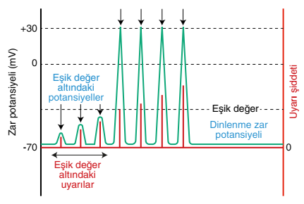 II. Eşik değeri geçen her uyarı aynı büyüklükte aksiyon potansiyeli oluşturur.