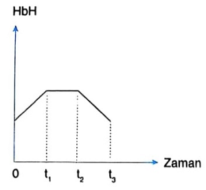 Sağlıklı bir insanın kanındaki hidroksihemoglobin (HbH+) miktarının zamanla değişimi aşağıda verilen grafikteki gibidir.