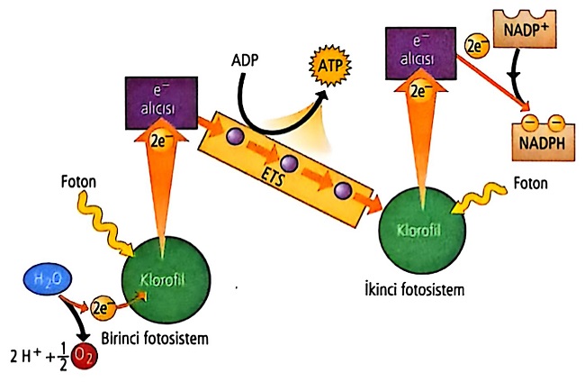 Klorofil ışıkla uyarılınca elektronlarını kaybeder. Bu elektronlar ETS elemanları üzerinden taşınırken enerji açığa çıkar. Bu enerjiyle ADP’den ATP sentezlenir.