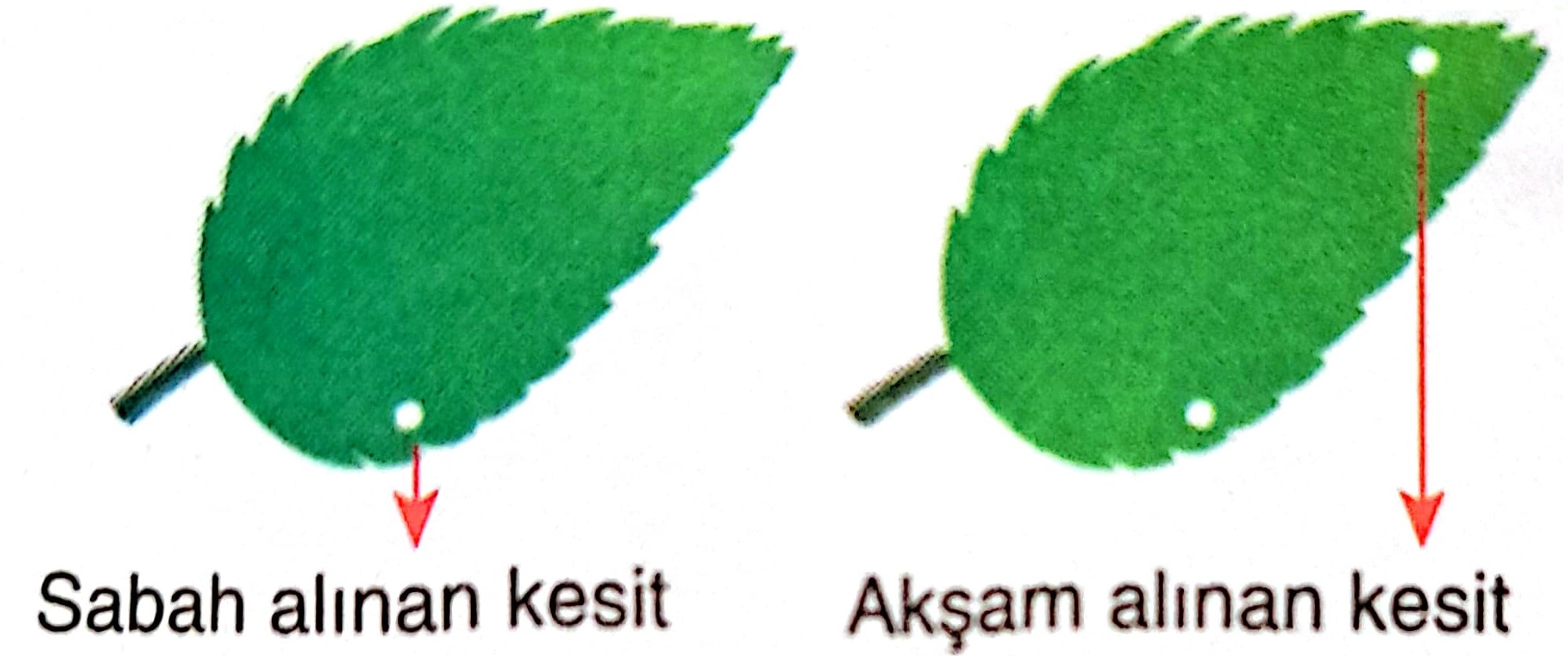 Bir saksı bitkisinin yaprağından sabah erken saatte bir kesit alınıp tartılmış daha sonra akşam saatlerinde aynı büyüklükte bir kesit alınıp tartılmıştır. İki kesit karşılaştırıldığında akşam alınanın daha ağır olduğu saptanmıştır.