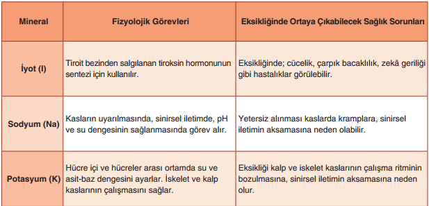 Aşağıda bazı mineraller, işlevleri ve eksikliklerinde ortaya çıkabilecek sağlık sorunları ile ilgili bir tablo verilmiştir.
