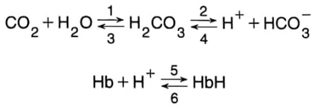 Verilen tepkimeler kanda karbondioksit (CO₂) taşınması sırasında gerçekleşen kimyasal süreçleri göstermektedir. Bu olaylar özellikle doku kılcalları ve alveol kılcallarında farklı yönde gerçekleşir.