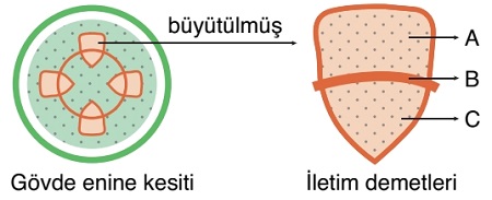 1. Sorunun İçeriği ve Ne Sorduğu: Bu soru, çift çenekli (dikotil) bir bitkinin gövde enine kesitinde bulunan açık iletim demetinin yapısını ve bu yapıyı oluşturan kısımların özelliklerini sorgulamaktadır. Şekil üzerindeki A, B ve C bölgelerinin hangi dokuları temsil ettiğini belirleyerek; bu dokuların kökeni, canlılık durumu ve bitki gelişimindeki rolleri hakkında verilen yargıların doğruluğunu analiz etmemiz istenmektedir.