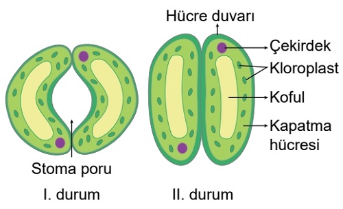 E Şıkkı: Turgor basıncının azalması bekçi hücrelerini flaksit (gevşek) hale getirir ve stoma porunun kapanmasını sağlar. Bu durum görseldeki I. durumdan II. duruma geçişin temel sebebidir.