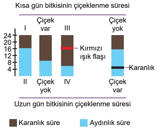 III ve IV Numaralı Durumlar (Kırmızı Işık Flaşlı Uzun Gece): Toplam karanlık süresi uzun olsa da (18 saat), bu süre bir kırmızı ışık flaşı ile kesintiye uğratılmıştır. Bitki, kesintiye uğramış uzun bir geceyi "iki kısa gece" olarak algılar.