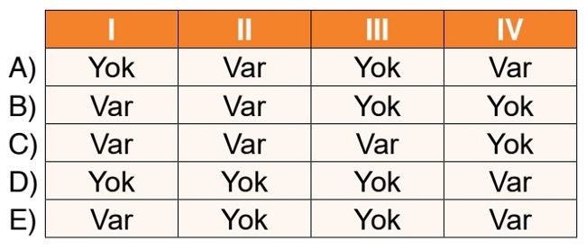 2. Doğru Cevap Şıkkı: A) I: Yok, II: Var, III: Yok, IV: Var