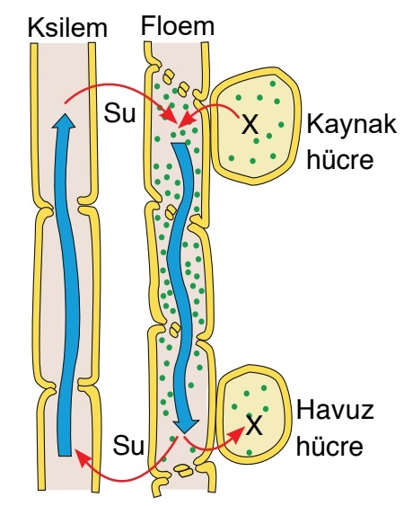 II. Suda çözünmeyen bir madde olabilir (Yanlış): Floemdeki taşıma işlemi, suyun oluşturduğu hidrostatik basınç farkına dayanır. Maddelerin bu sistemle taşınabilmesi ve hücre zarlarından (kaynaktan floeme veya floemden havuza) geçebilmesi için mutlaka suda çözünür olması gerekir. Nişasta gibi suda çözünmeyen büyük moleküller bu yolla taşınamazlar.