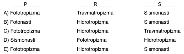 2. Doğru Cevap Şıkkı: E) P: Fototropizma, R: Hidrotropizma, S: Sismonasti