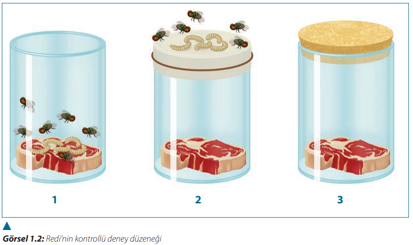 Redi’nin deneyinde sineklerin etle temas etmediği durumda kurtçukların oluşmadığı gözlemlenmiş, böylece sineklerin kurtçuklara sebep olduğu sonucuna varılmıştır. Pasteur’ün deneyinde ise kaynattığı et suyuna dış ortamdan mikroorganizmaların ulaşmadığı sürece gelişme olmadığı, ancak şişe kırıldığında mikroorganizmaların geliştiği tespit edilmiştir.