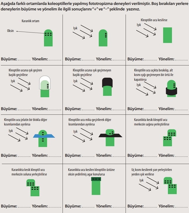 5. Koleoptil ucu açık bırakılarak koleoptilin diğer kısımları ışık geçirmeyen siyah bir örtü ile kapatıldığında ışığa yönelim olmuştur.