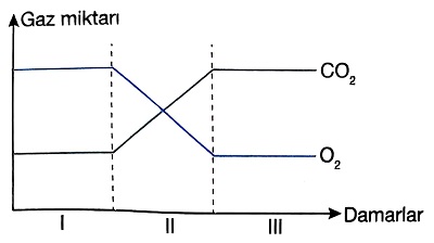 Grafikte O₂ (oksijen) ve CO₂ (karbondioksit) miktarlarının üç farklı damarda nasıl değiştiği gösteriliyor.