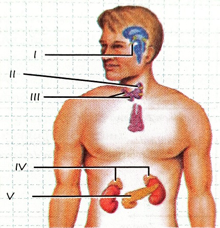 Açıklaması: I. Hipofiz Bezi II. Tiroit Bezi III. Paratiroit Bezi IV. Böbrek üstü bezleri V. Pankreas