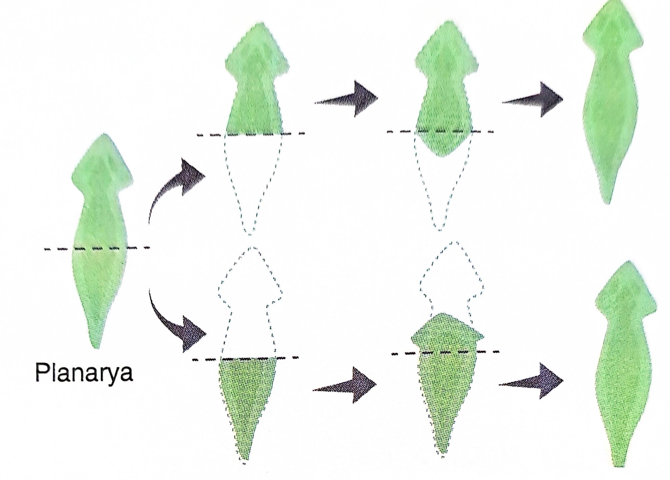 ♦ Deniz yıldızı, planarya ve halkalı solucanda kopan parçalardan yeni bireylerin oluşması üreme düzeyinde rejenerasyondur. Bu canlılarda rejenerasyon ile tüm vücut yenilenebilir. Yeni bir canlı oluştuğu için eşeysiz üreme kabul edilir.