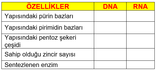 DNA ve RNA moleküllerinin özellikleri ile ilgili aşağıdaki tabloyu uygun ifadelerle tamamlayınız.