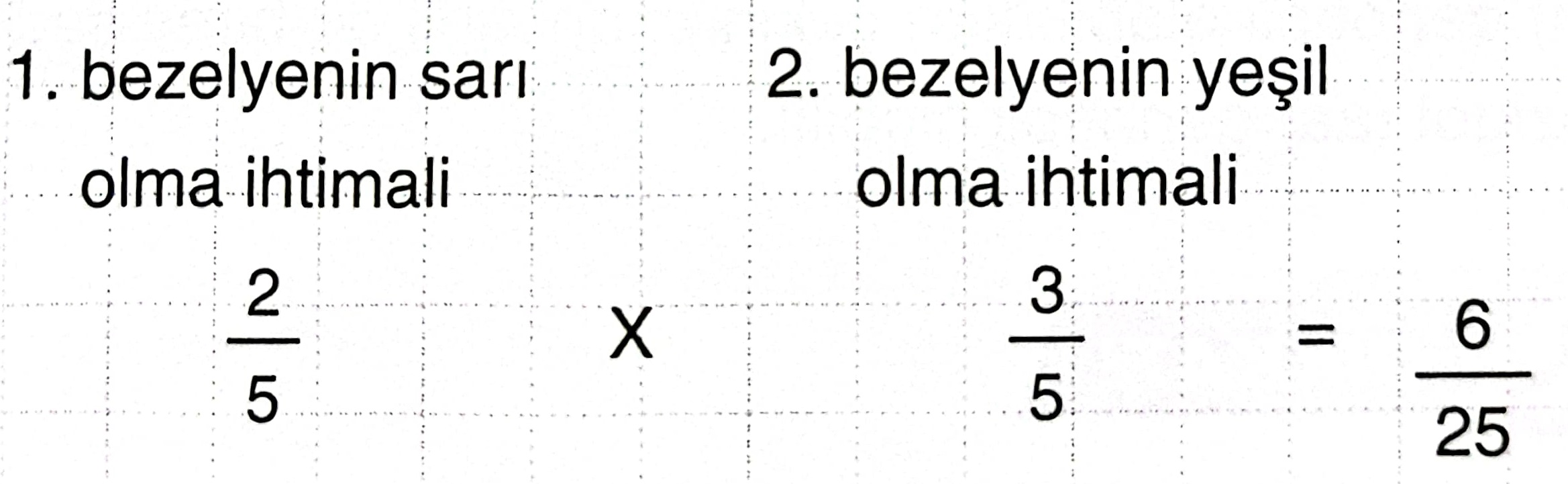 Bir torbada üç tanesi yeşil, iki tanesi sarı olan beş bezelye bulunmaktadır. Torbadan bir bezelye çıkarılıyor ve tekrar torbaya konulduktan sonra ikinci bir bezelye daha çıkarılıyor.