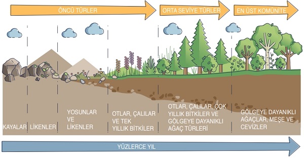 ► Bu süreçte önce yeni koşullara hızla uyum sağlayabilen öncü türler ortaya çıkar ve ortamı değiştirerek başka canlıların yerleşmesine zemin hazırlar.