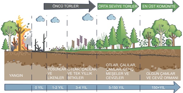 ► Uygun koşullarda bu süreç yaklaşık 150 yıl içinde, yangın öncesine benzer bir topluluğun yeniden oluşmasına kadar ilerleyebilir.